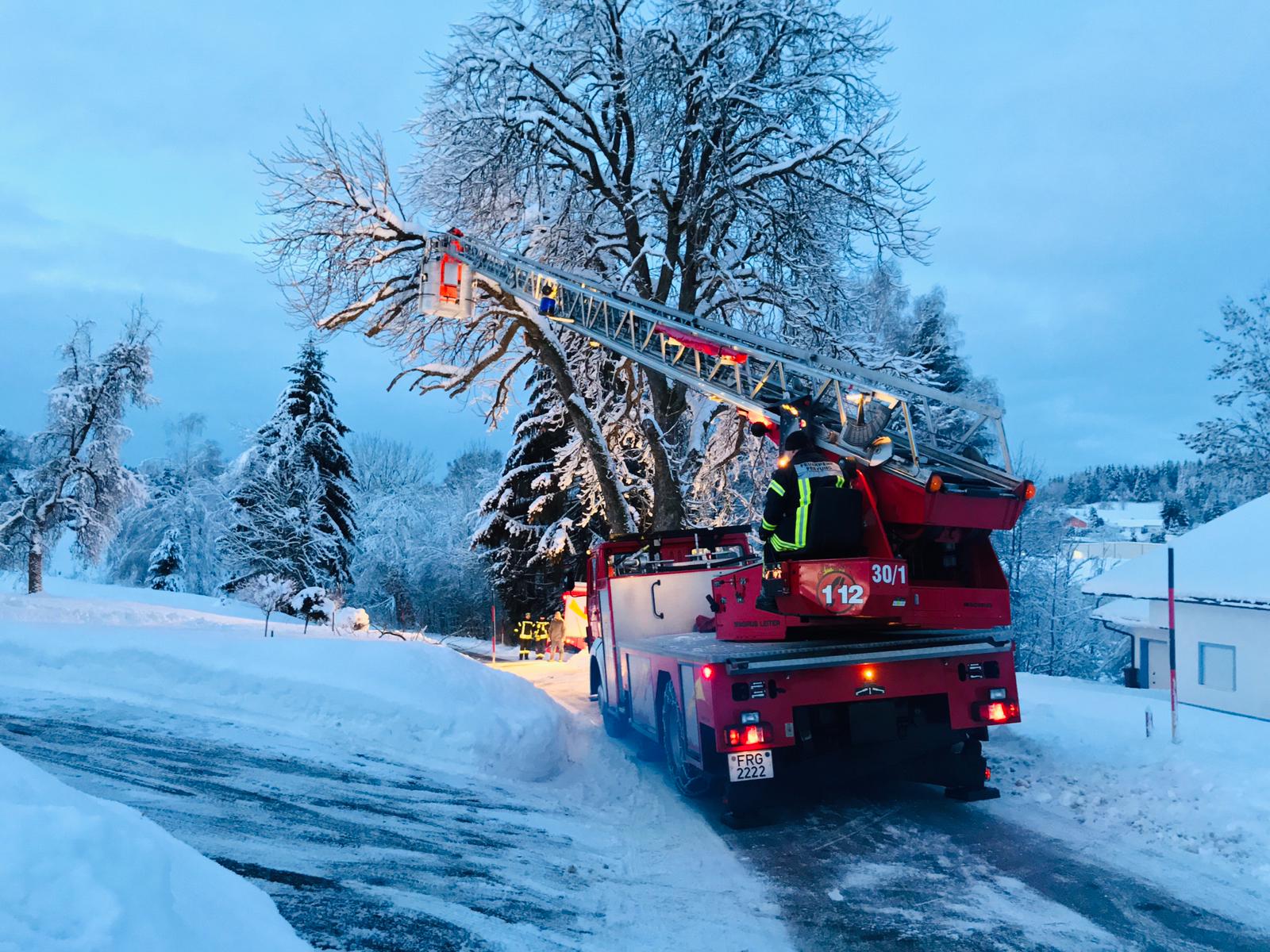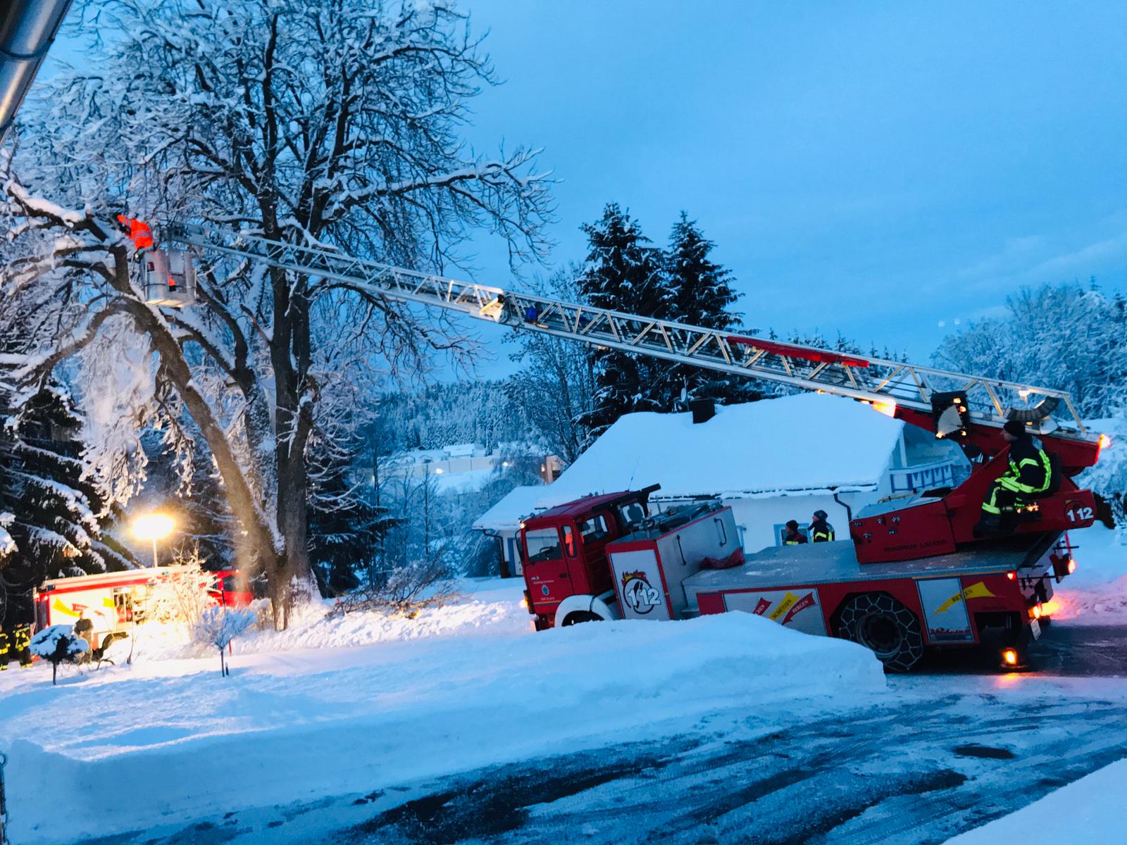 Heute früh wurde uns per Piepser ein Baum gemeldet, der auf ein Haus zu stürzen drohte. Als Einsatzörtlichkeit wurde die Saußbachstraße in Freyung angeben. Hier konnte jedoch kein Baum festgestellt werden. Nach mehreren Nachfragen bei der ILS sowie der Polizeiinspektion Freyung konnte schließlich die Saußbachweg in Hinterschmiding, Sonndorf herausgefunden werden. Nach Rücksprache mit dem Hinterschmidinger Kommandanten, der hier zuständig ist, entfernten wir mehrere angebrochene bzw. morsche Äste mit der Drehleiter. Nach ca. 2 Stunden war der Einsatz für uns beendet.