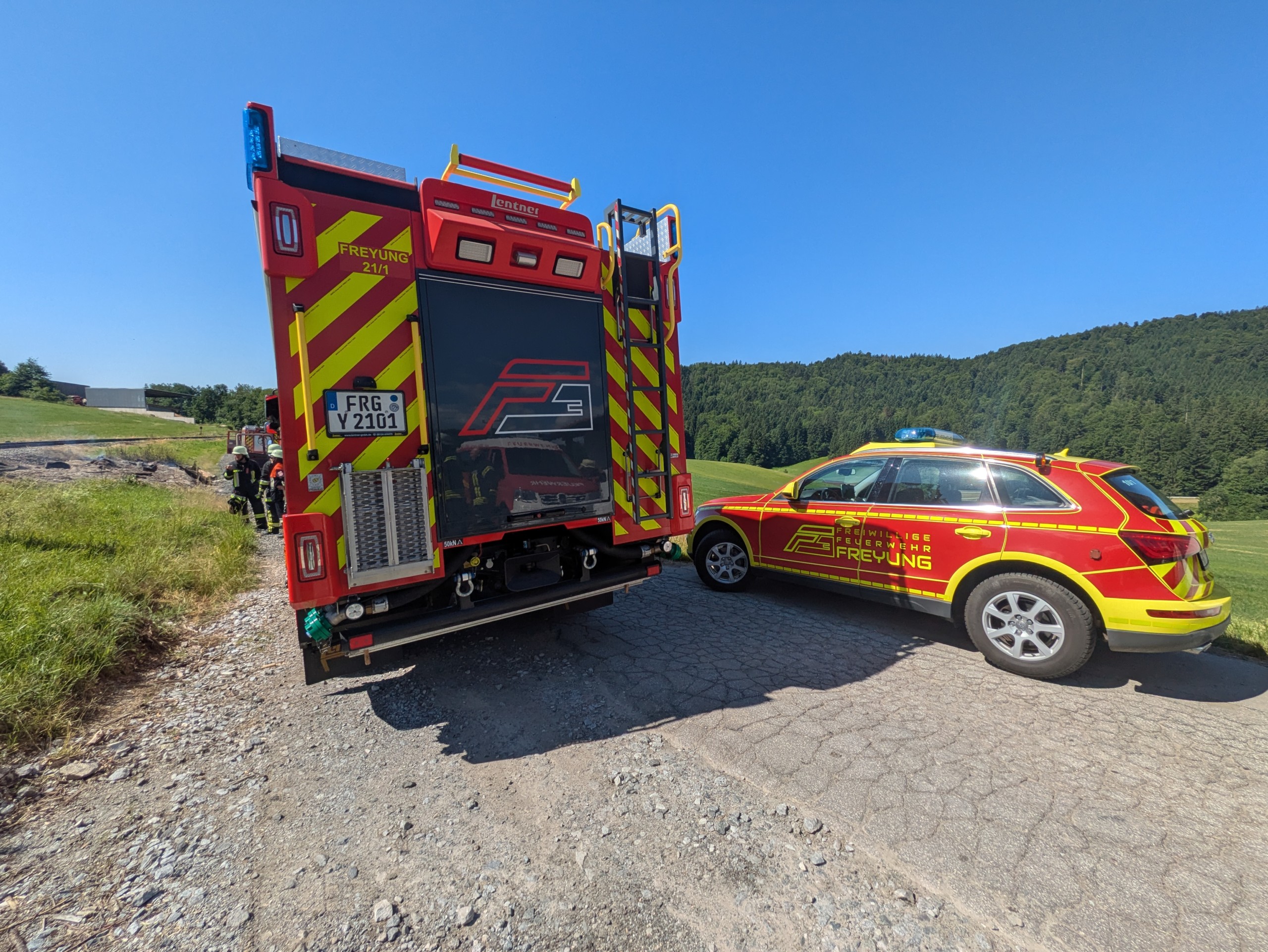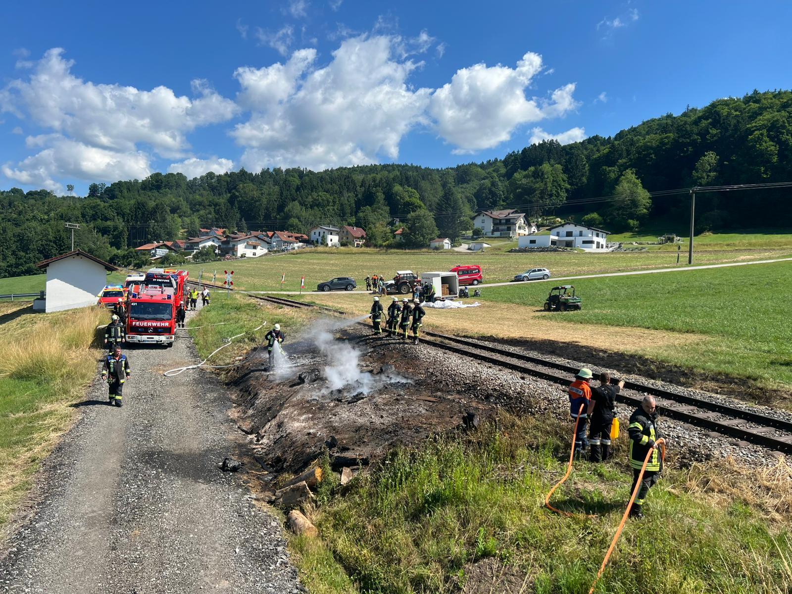 Am heutigen Sonntagvormittag wurde uns ein Brand am Bahndamm in Grillaberg mitgeteilt. Zusammen mit der örtlich zuständigen Wehr Winkelbrunn konnte schnell Entwarnung gegeben werden. Das gestrige Sonnwendfeuer rauchte noch leicht, die Abbauarbeiten fanden direkt daneben statt. Vorsorglich entschied sich der Einsatzleiter den betroffenen Bereich gründlich zu bewässern. Für die Dauer der Löscharbeiten wurde durch den Notfallmanager der Bahn die Strecke gesperrt. Ein Dank an dieser Stelle an die Dorfgemeinschaft Grillaberg, die uns bei diesen sommerlichen Temperaturen noch mit kalten Getränken versorgten. Nach einer Stunde waren wir zurück am Gerätehaus.