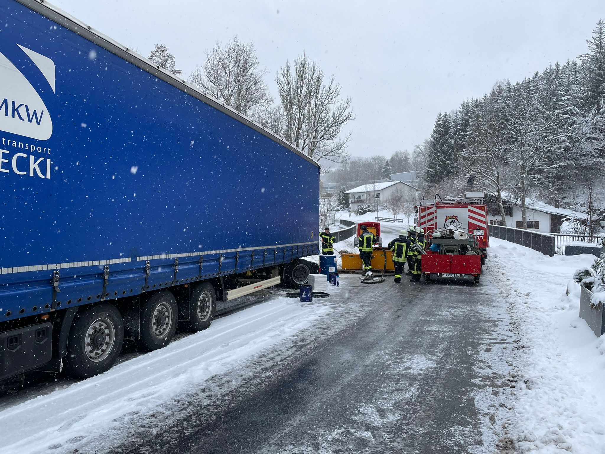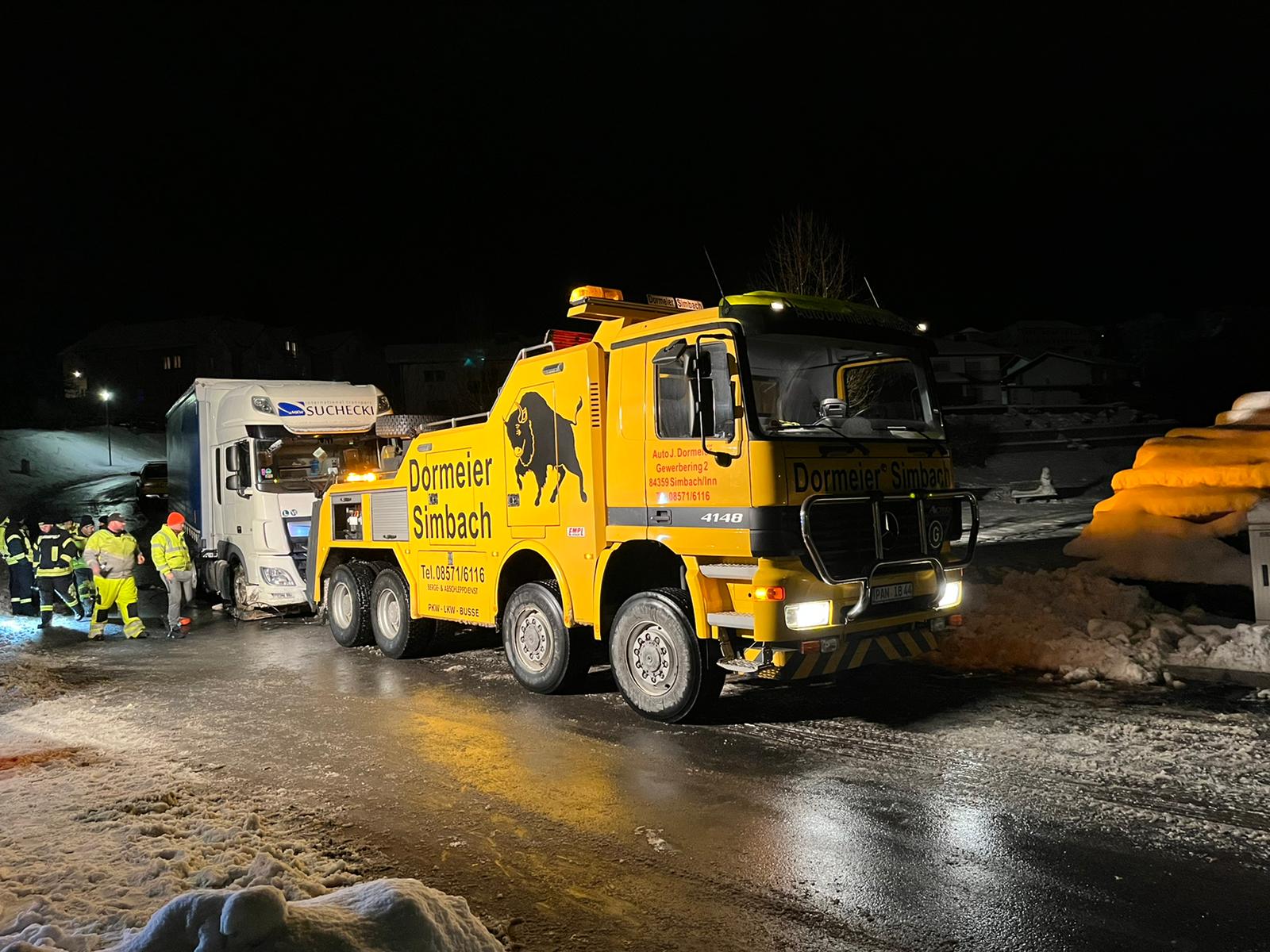 Gestern Nachmittag geriet auf schneebedeckter Fahrbahn ein Sattelzug im Mittermühlenweg auf die Gegenfahrbahn und kollidierte mit einer Straßenlaterne. Dadurch wurde der Dieseltank aufgerissen. Die zuerst alarmierte Wehr aus Ahornöd ließ uns nachalarmieren. Wir rückten mit dem Ölschaden-Anhänger aus und pumpten mittels Handmembranpumpe den Diesel um. Des weiteren wurde der ausgetretene Kraftstoff gebunden. Die Abschleppung zögerte sich bis in die späten Abendstunden hinein, unser Einsatz war erst gegen 21:30 Uhr beendet. Die Feuerwehr Köppenreut/Falkenbach wurde zur Verkehrslenkung im Verlaufe des Einsatzes nachalarmiert. Die Straßen war teilweise komplett gesperrt.