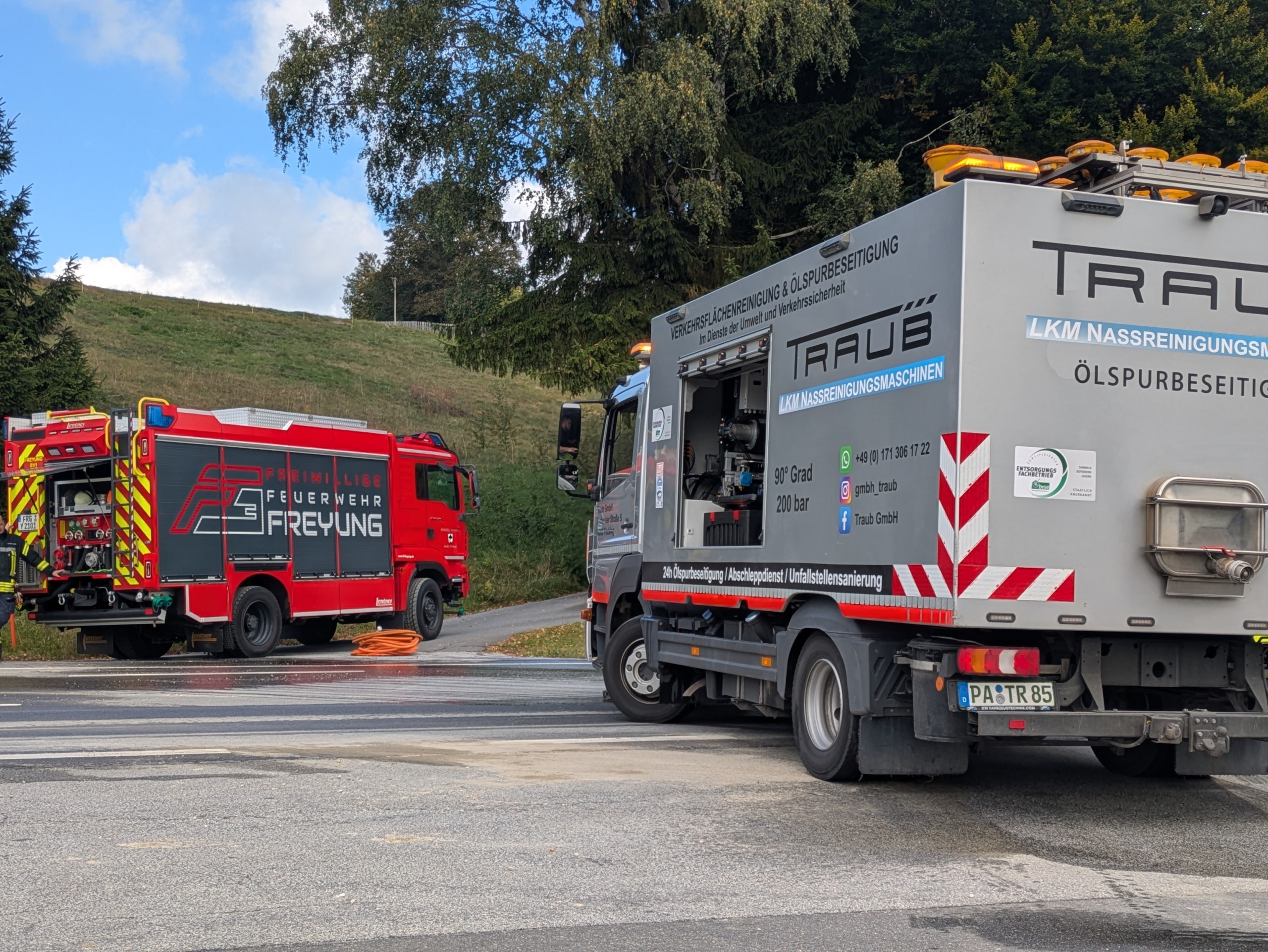 Aus uns nicht bekannten Gründen verlor heute Vormittag ein Betonmischer eine größere Menge Beton auf der B 12 zwischen Kreisverkehr und Abzweigung Bannholz. Zur Unterstützung der Straßenmeisterei und Polizei bei der Verkehrsregelung sowie der Säuberung der Fahrbahn wurde zuerst die örtlich zuständige Ahornöder Wehr und kurz darauf die FF Freyung mit einem wasserführenden Fahrzeug alarmiert. Ein Spezialunternehmen aus Pocking musste zur Grundreinigung und Entfernen des Betonschleiers anrücken. Damit der Beton nicht fest wird, haben wir bis zum Eintreffen der Reinigungsmaschine die Oberfläche feucht gehalten. Für die Dauer der Sperrung sowie der Reinigungsarbeiten musste der Verkehr halbseitig gesperrt werden, weshalb gerade in der Mittagszeit längere Staus entstanden. Gegen 14:00 Uhr waren die Arbeiten beendet und die Straße konnte wieder freigegeben werden.