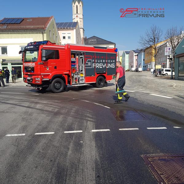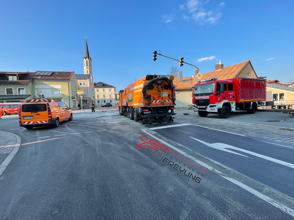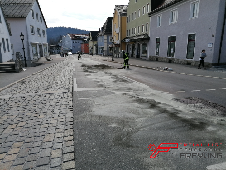 Kurz nach Mittag wurden wir zu einer Ölspur in die Bahnhofstraße alarmiert. Für gewöhnlich handelt es sich dabei um eher kurzweilige Einsätze, in diesem Fall waren wir über Stunden gebunden. Ein Traktorgespann verlor viele Liter Hydrauliköl, welches sich von der Bahnhofstraße etwa auf Höhe Bäckerei Kittl bis zur Pizzeria Antonio in der Passauer Straße zog. Hier kam schließlich auch der Traktor zum stehen. Auf Grund der Dimension der Ölspur wurde die Wehr aus Winkelbrunn zur Unterstützung nachgefordert. Das noch auslaufende Hydrauliköl des Traktors wurde mittels Mulden aufgefangen. Ebenso wurde KBM Feuchter alarmiert, welcher Ölbinderreserven aus dem Kreisbauhof aushändigte.  Diese wurden mit unserem Versorgungs-Lkw an die Einsatzstelle transportiert. Insgesamt wurden dutzende Sack Ölbinder aufgestreut Um die Arbeiten effektiv durchführen zu können, wurde die Bahnhofstraße auf Höhe Parkdeck und die Passauer Straße auf Höhe Sparkasse komplett gesperrt. Der Straßenbaulastträger veranlasste auf Grund der massiven Verschmutzung die Verständigung der Spezialfirma Umwelt Wurzer aus Erding, welche den Fahrbahnbelag intensiv reinigte. Diese Spezialmaschine garantiert nach Reinigung eine über 99-prozentige Sauberkeit der Straße. Auf Grund des langen Anfahrtsweges waren wir erst nach über 6 Stunden Einsatzdauer wieder am Gerätehaus. Hier stand noch die Reinigung der Einsatzmittel an.