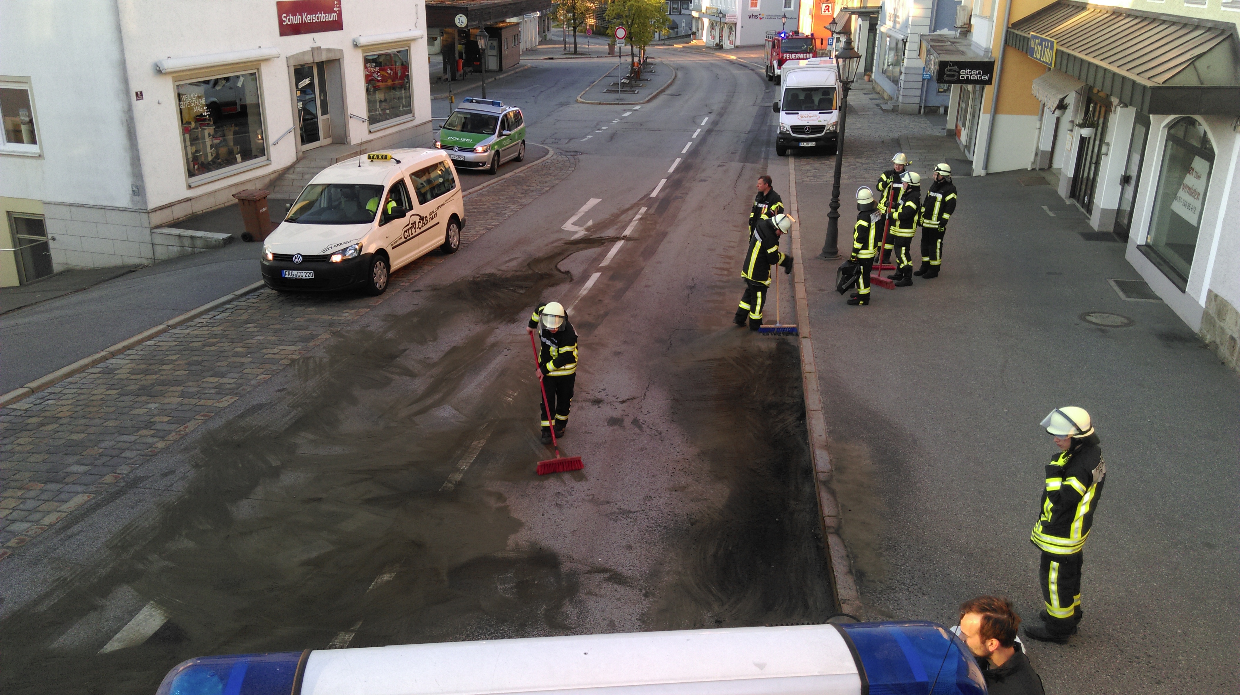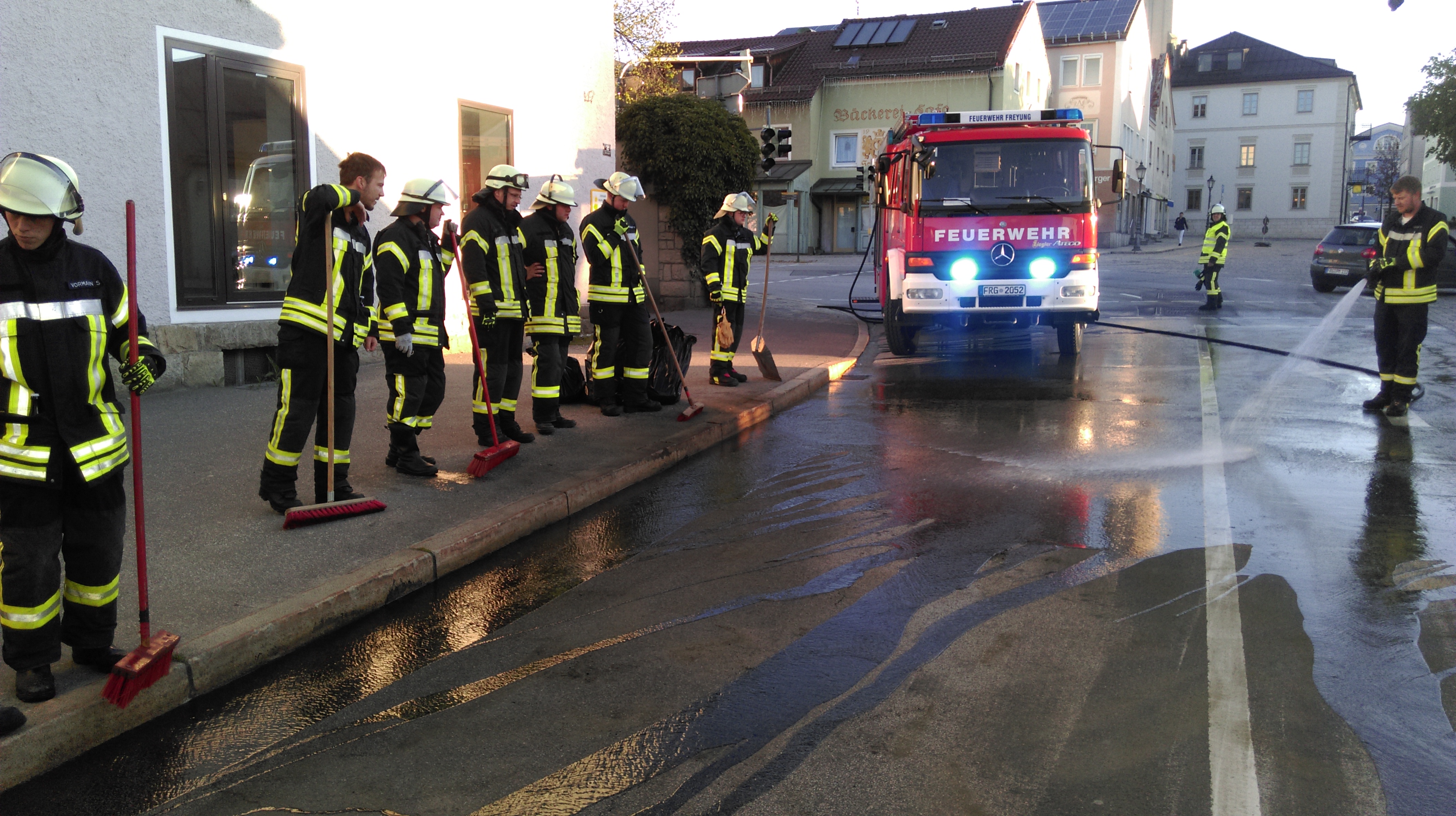 Heute früh mussten wir zu einer Ölspur ausrücken. Bei einem LKW platzte ein Hydraulikschlauch und eine große Menge Öl lief auf die Kreuzung Bahnhofstraße/Passauer Straße in Richtung Busbahnhof. Mit Bindemittel wurde das Öl gebunden, die Straße mit Wasser gereinigt und im Anschluss an die Straßenmeisterei übergeben.