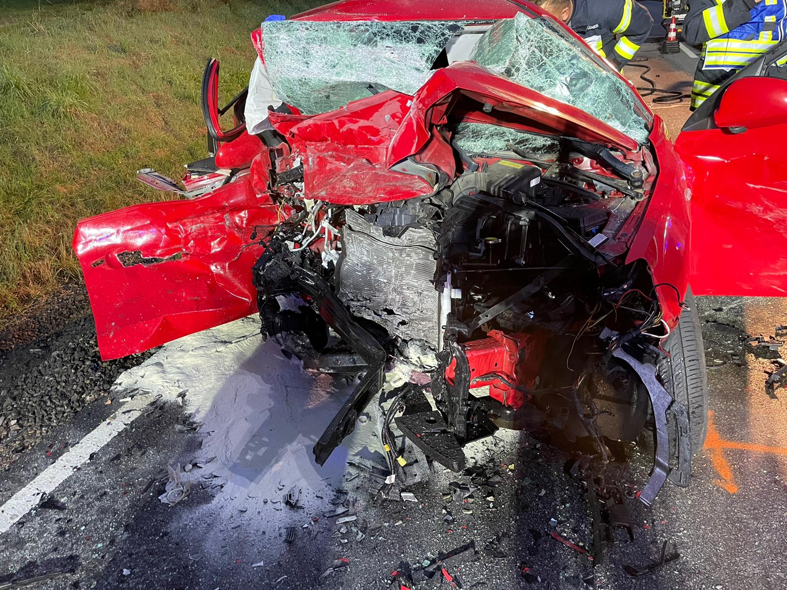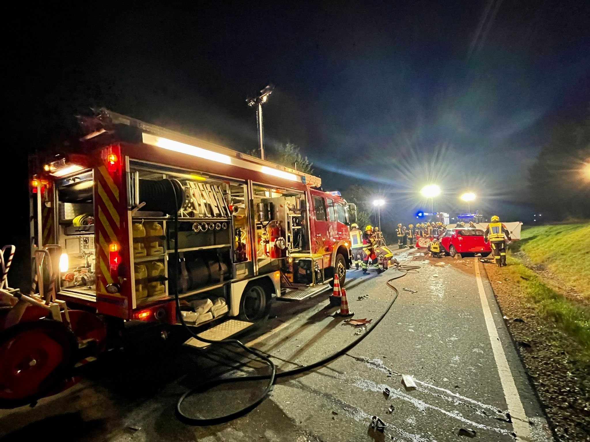 Heute Nacht wurden wir zusammen mit weiteren umliegenden Wehren zu einem schweren Verkehrsunfall mit eingeklemmter Person auf die B 12 Höhe Heldengut alarmiert. Des Weiteren war gemeldet, dass beide Fahrzeuge rauchen bzw. zu brennen beginnen. Sofort machte sich unser MZF, besetzt mit den beiden Kommandanten, als Führungsfahrzeug auf zur Erkundung. Kurz drauf rückte auch das LF 16 mit dem hydraulischen Rettungssatz aus. Die Unfallstelle konnte nach kurzer Zeit erreicht werden, da sie nicht wie gemeldet auf Höhe Heldengut sondern Höhe Sonndorf war. Wir trafen als erste Feuerwehrkräfte fast zeitgleich mit dem Rettungsdienst und dem Notarzt ein. Sofort wurde die Lage erkundet und eine eingeklemmte Person vom Notarzt notfallmedizinisch erstversorgt. Glücklicherweise bestätigte sich die Erstmeldung der brennenden Fahrzeuge nicht. Während der Erstversorgung stellten wir den Brandschutz sicher und bauten die Geräteablage auf. Nach Absprache mit der Notärztin begannen wir mit der Befreiung der Person. Dazu musste mittels Rettungszylinder und -spreizer das Lenkrad weggedrückt werden. Danach konnte der Fahrer schonend aus dem Fahrzeug gerettet werden. Der Fahrer des zweiten Fahrzeugs wurde durch Polizisten aus dem Fahrzeug befreit und ebenfalls an den Rettungsdienst übergeben. Die B 12 musste komplett gesperrt werden. Da der Schwerlastverkehr bereits am Kreisverkehr in Freyung abgeleitet werden musste, wurde hier die Verkehrslenkung durch den GW-Notstrom eingerichtet sowie die Feuerwehr Kreuzberg an die „Würth-Kreuzung“ nachalarmiert. An den beiden Fahrzeuge, welche augenscheinlich frontal zusammenstießen, entstand Totalschaden. Den Verletzten Personen wünschen wir auf diesem Weg schnelle und vollständige Genesung. An dieser Stelle darf die hervorragende Zusammenarbeit aller beteiligten Rettungsorganisationen hervorgehoben werden. Die B 12 war für die Unfallaufnahme sowie Fahrbahnreinigung über mehrere Stunden gesperrt.