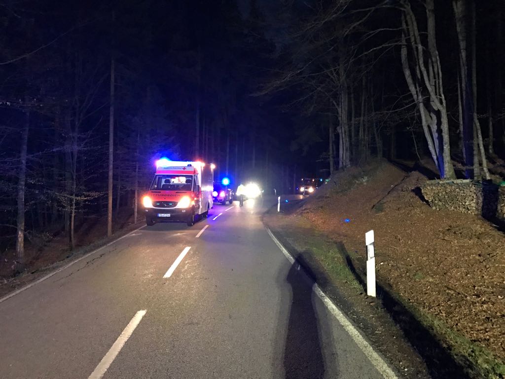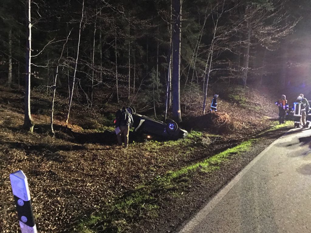 Heute Abend ereignete sich auf der Staatsstraße 2630 zwischen Kaining und Unterseilberg ein schwerer Verkehrsunfall. Ein Pkw verlor aus bislang unbekannter Ursache die Kontrolle, überschlug sich und kam auf dem Dach zum liegen. Für die alarmierten Wehren aus Rehberg, Grainet und Freyung hieß es „Verkehrsunfall mit eingeklemmter Person“. Die eintreffende Rettungsdienst konnte die Insassen jedoch ohne Hilfe der Feuerwehr befreien. Wir halfen bei der Verkehrsregelung und Säuberung der Unfallstelle.