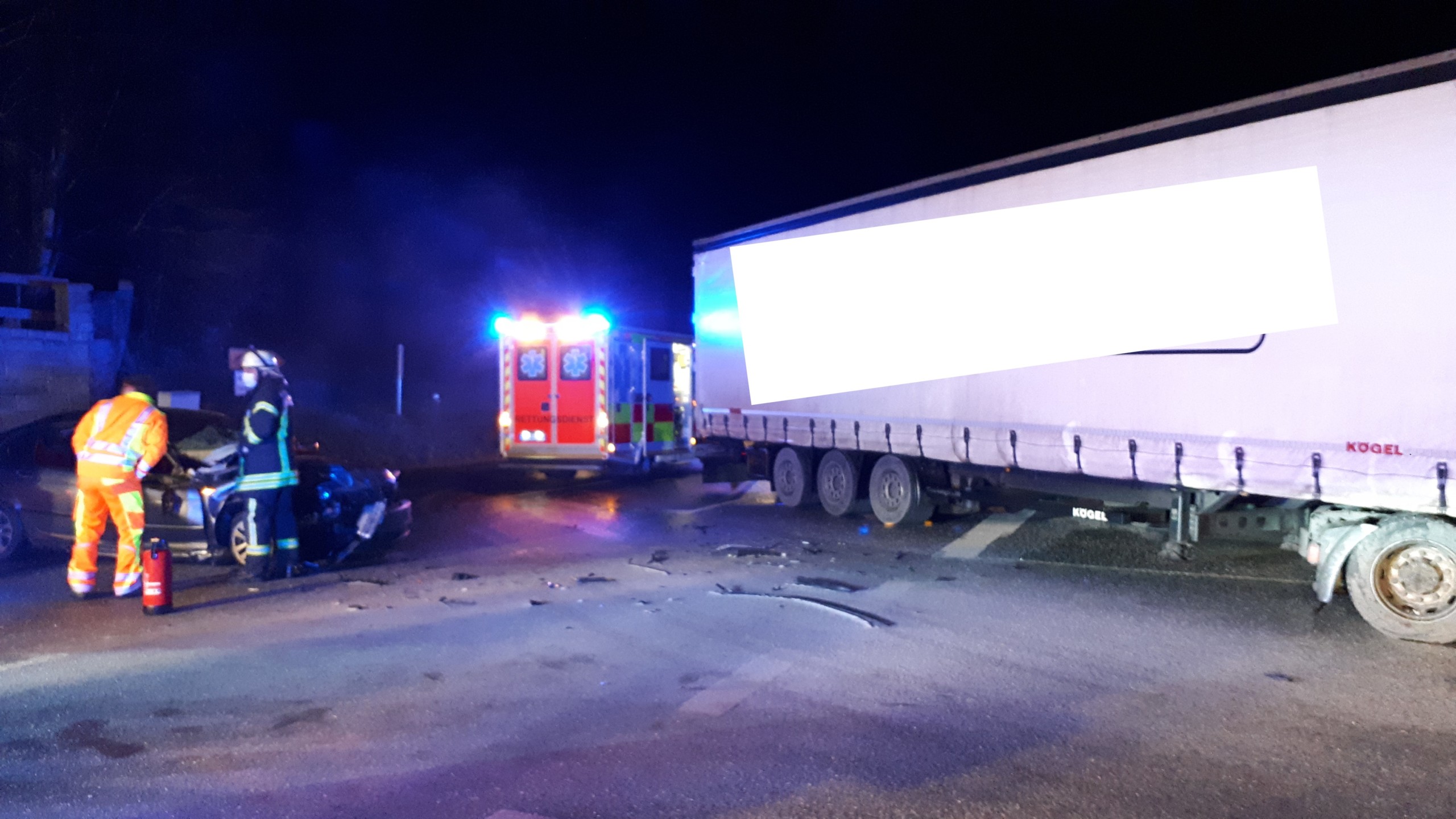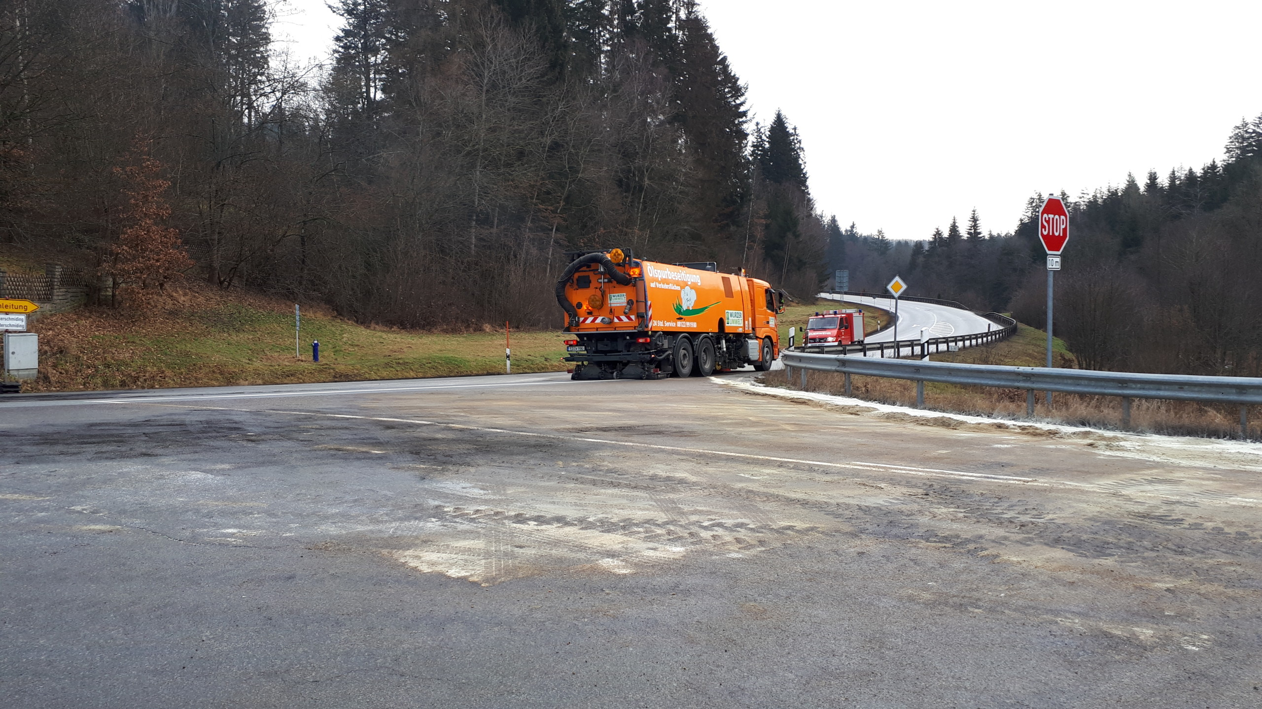 Ein folgenschwerer Verkehrsunfall ereignete sich heute um kurz vor 6 Uhr auf der B 12 Höhe Abzweigung Bannholz. Hier stießen ein Lkw-Sattelzug sowie ein Pkw mit hoher Geschwindigkeit zusammen. Glück im Unglück hatte der Pkw-Fahrer, der laut ersten Auskünften lediglich mittelschwer verletzt wurde. Der Lkw-Fahrer blieb unverletzt. Da der Kreuzungsbereich komplett gesperrt werden musste, wurden umgehend die Wehren aus Philippsreut und Kreuzberg nachalarmiert, um eine großräumige Umfahrung einzurichten. Bei dem Zusammenstoß wurde der Diesel-Tank des Lkw so stark beschädigt, dass eine große Menge an Diesel austrat. Diese wurde mit einer Vielzahl an Ölbindemittelsäcken gebunden. Der Diesel geriet zum Teil in den angrenzenden Bach, woraufhin mehrere Ölsperren durch uns eingesetzt wurden. Hierzu war ein Vertreter des Wasserwirtschaftsamtes Deggendorf an die Einsatzörtlichkeit alarmiert worden. Der restliche im Tank befindliche Diesel wurde durch uns abgepumpt. Da die Unfallstelle so erheblich verschmutzt war, wurde durch den Straßenbaulastträger eine Spezialfirma zur Ölspurbeseitigung aus Erding angefordert. Diese reinigte mehrere Stunden lang die Unfallstelle. An beiden Fahrzeugen entstand erheblicher Sachschaden. Die B 12 war für die Dauer von ca. 6 1/2 Stunden zwischen Philippsreut und Kreisverkehr Freyung komplett gesperrt. Auf Grund des geringen Fahrzeugaufkommens hielten sich die Verkehrsbehinderungen in Grenzen. Unsere Arbeit war jedoch noch lange nicht getan, da Material und Gerätschaften bis in den späten Nachmittag hinein nachgefüllt und gesäubert werden musste. Ein Dank an die Fa. Stadler, Fa. Krammer, Metzgerei Brodinger sowie unsere Frauen, welche uns mit Kaffee und Brotzeit versorgten.