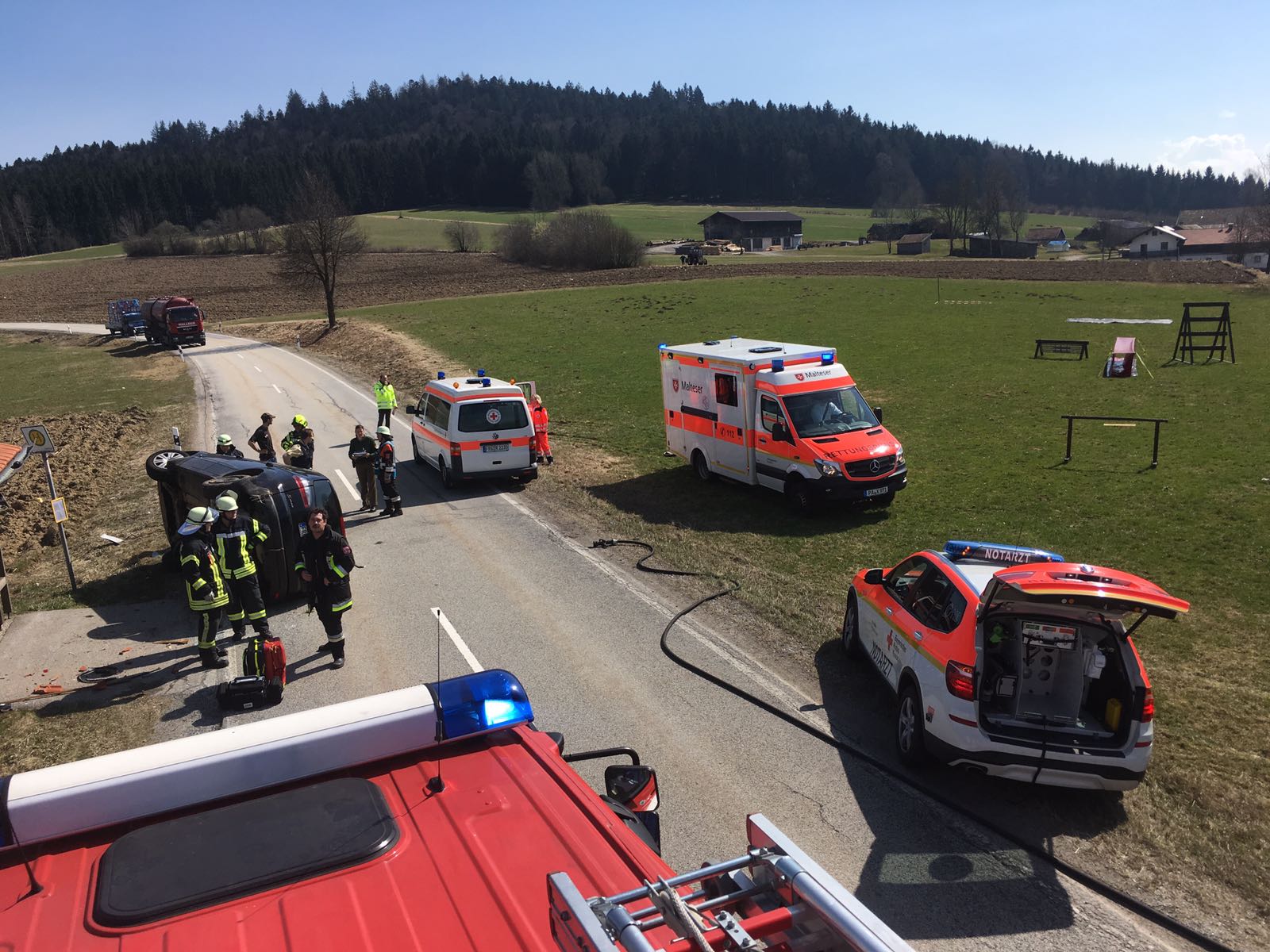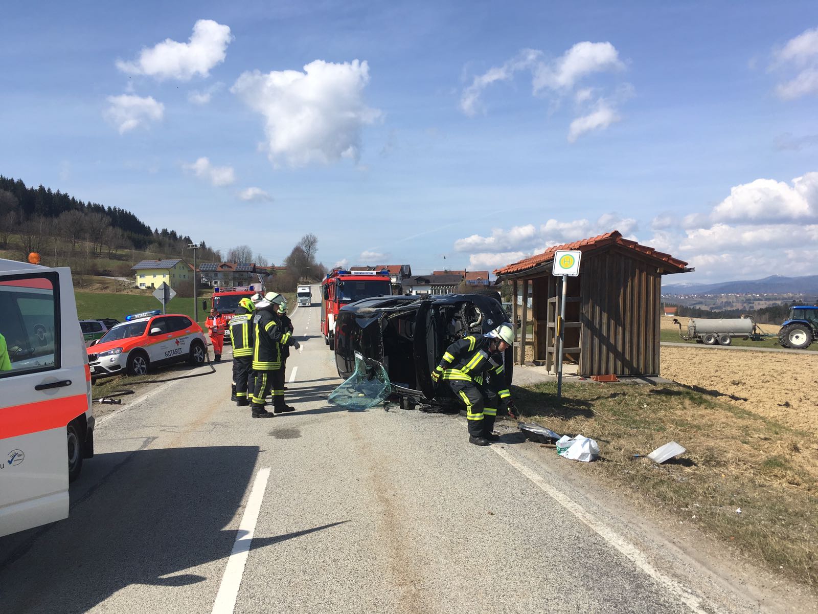 Verkehrsunfall mit auslaufenden Betriebsstoffen, so lautete die Meldung der ILS Passau, zu der die FF Winkelbrunn heute Nachmittag zum Ortsausgang Richtung Promau alarmiert wurde. Ein Pkw lag auf der Seite und blockierte einen Teil der Straße. Zur Verkehrslenkung und Unterstützung an der Unfallstelle wurden wir nachalarmiert. Kurz nachdem wir an der Einsatzstelle ankamen, wurden wir zum nächsten Einsatz alarmiert. (siehe Einsatz Nr. 18)